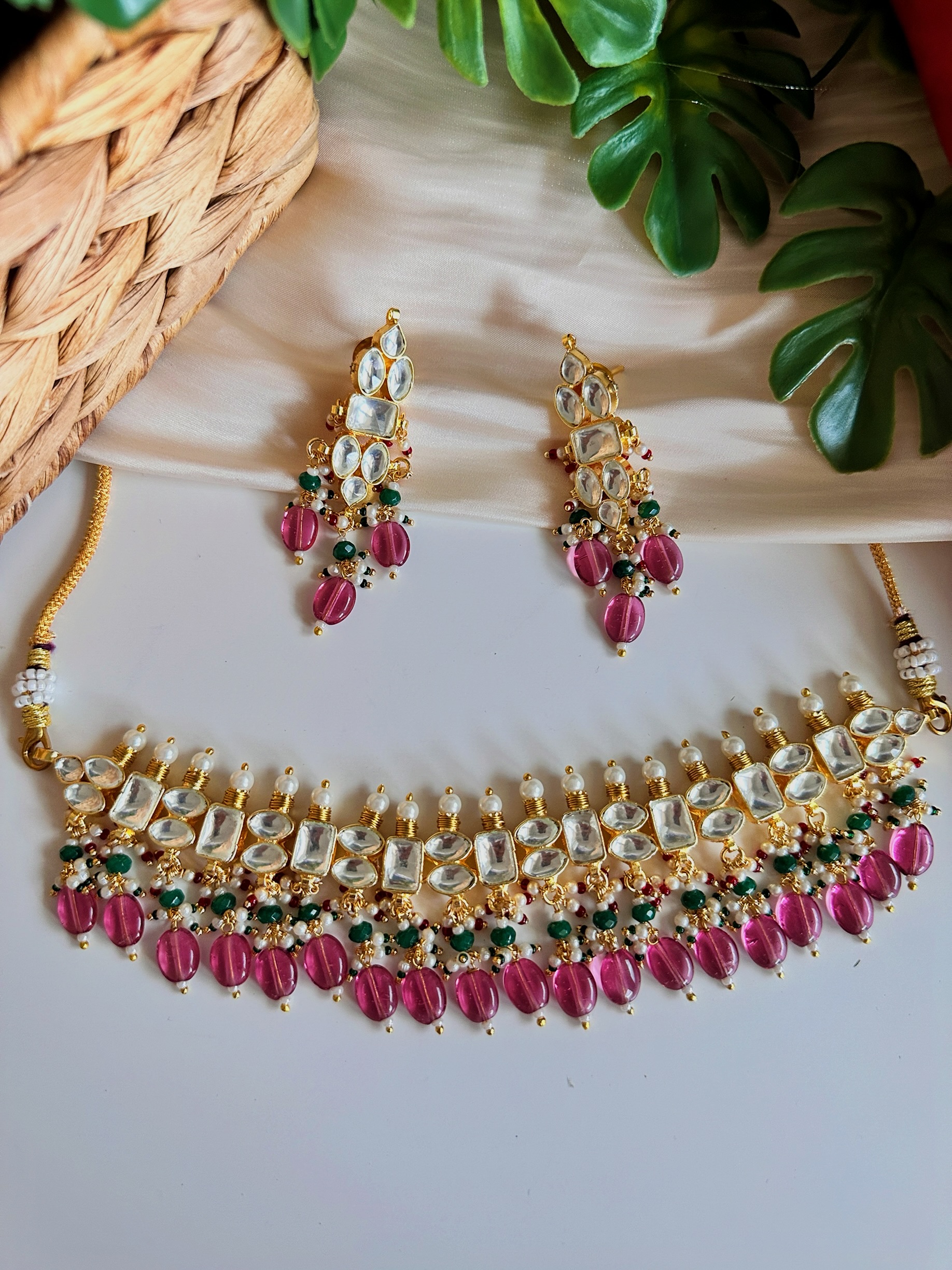 $85.00Pachi Kundan necklace Set Comes with earrings Choker style necklace set Onion pink color rice beads