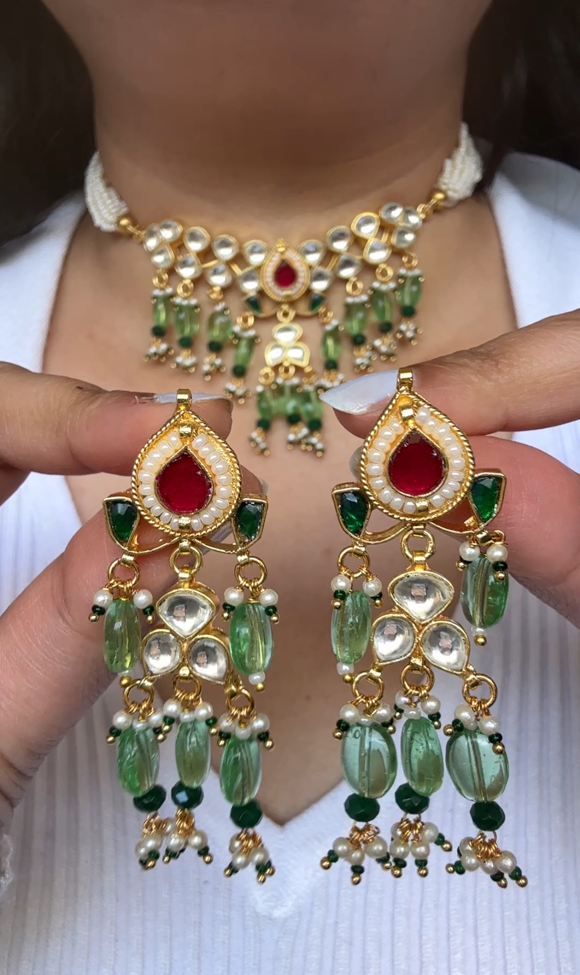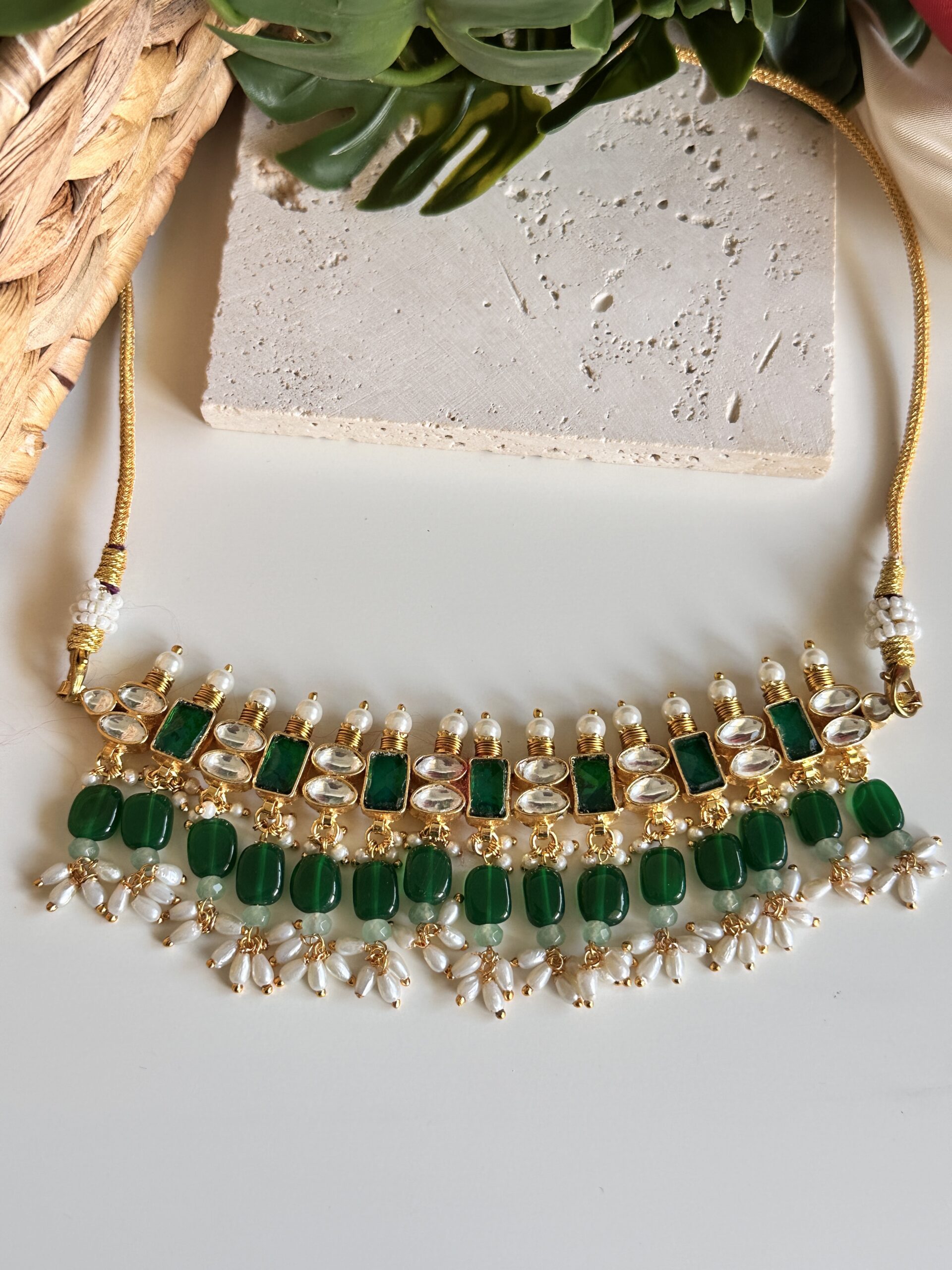 $85.00Pachi Kundan necklace Set Comes with earrings Choker style necklace set Light Green and dark green rice beads