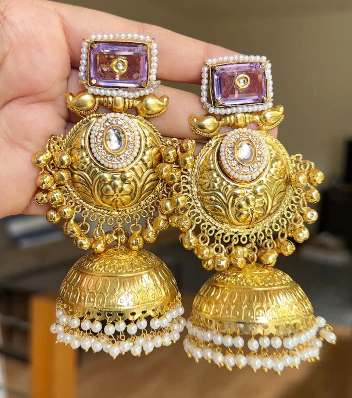 Add a touch of timeless elegance to your ethnic collection with these traditional gold Jhumka earrings. Featuring intricate craftsmanship, they are adorned with dazzling gemstones and delicate pearl embellishments, making them the perfect accessory for weddings, festive celebrations, or any special occasion.